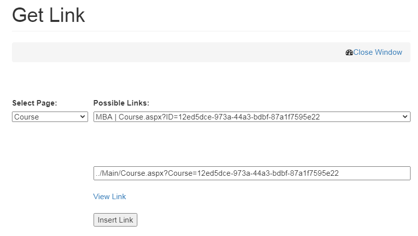 • Click on Get Local link, select Course/ Course List from the select Page drop down menu and click on Insert Link.