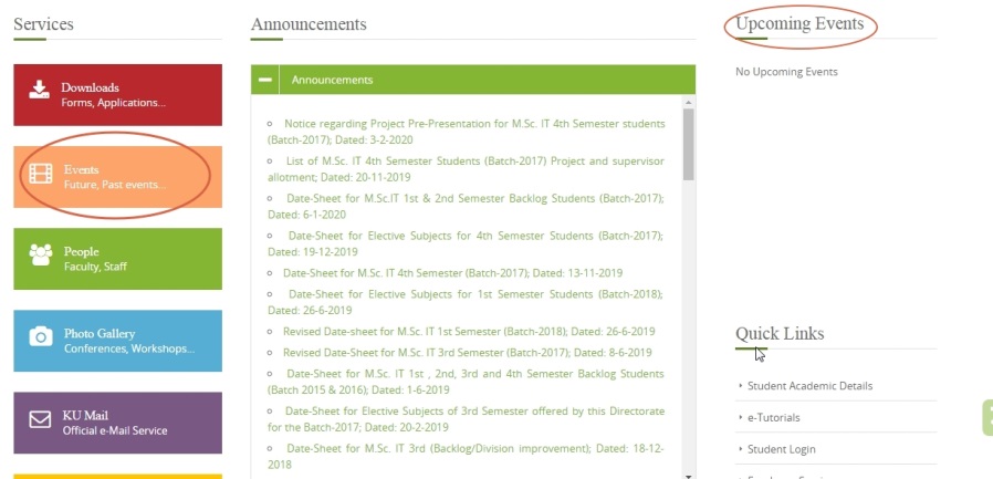 To keep a note of all the events, so that students are kept informed, every department has an event section on their website. Any Update on event is highlighted in events section and future events also scroll in Upcoming Events.